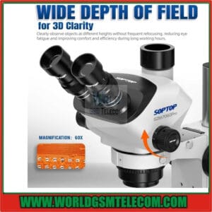 Precision inspection work becomes inefficient when microscopes lack image clarity, stable magnification, or camera expandability. Inconsistent focus and narrow viewing fields slow down diagnostics and increase eye strain during long sessions. The Soptop SZM 7060 Pro Trinocular Stereo Microscope is designed to solve these issues with a professional optical system, continuous 7x to 60x zoom, and a trinocular viewing head that supports camera attachment. It delivers sharp, distortion free imaging while allowing documentation and live display when required. Technicians and professionals trust this microscope because it offers smooth magnification control, excellent stability, and reliable optical performance for demanding inspection and precision work.